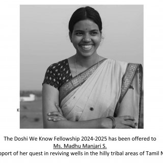 Ms. MADHU MANJIRI S. TamilNadu has been awarded as a recipient of Doshi We Know Fellowship 2024-2025. She has done tremendous work and shown great commitment towards her quest in reviving wells in the hilly tribal areas of Tamil Nadu. This fellowship encourages her to document the process so that many other groups around the country can benefit from her work.